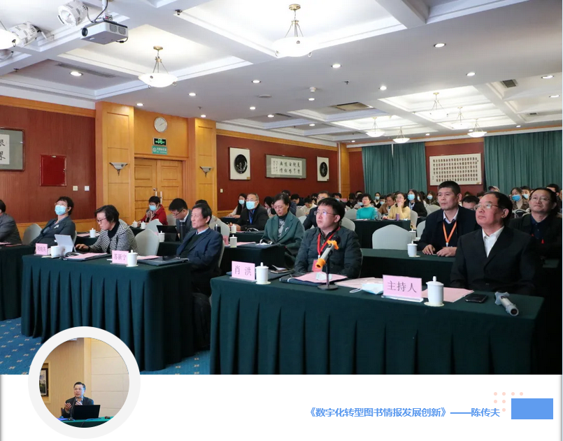 大会邀请国务院学位委员会图书情报与档案管理学科评议组召集人、武汉大学研究生院院长陈传夫教授作线上主旨报告,陈教授以《数字化转型图书情报发展创新》为题,介绍了开放环境的特点、开放科学的原因以及对图书馆的挑战和机遇,并探讨了在开放环境下图书馆如何创新人才培养模式,提升科研服务水平。